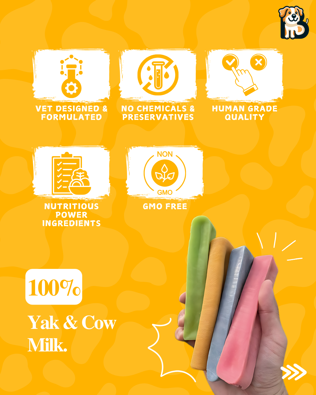 Made from yak and cow milk, they’re easier on the stomach and safer than rawhide treats.